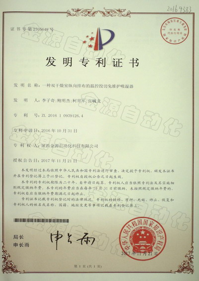 u 祝賀我公司研發(fā)的一種雙干燥室縱向排布的溫控投切免維護(hù)吸濕器,再次獲得國(guó)家知識(shí)產(chǎn)權(quán)局頒發(fā)的發(fā)明專利。這是該產(chǎn)品投入市場(chǎng)后取得的第二個(gè)發(fā)明專利。